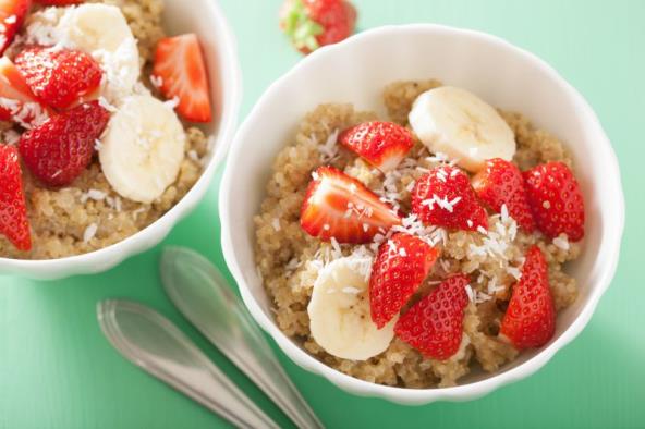 4. Pomešajte banane i jagode sa skuvanom kinoom i poslužite.
