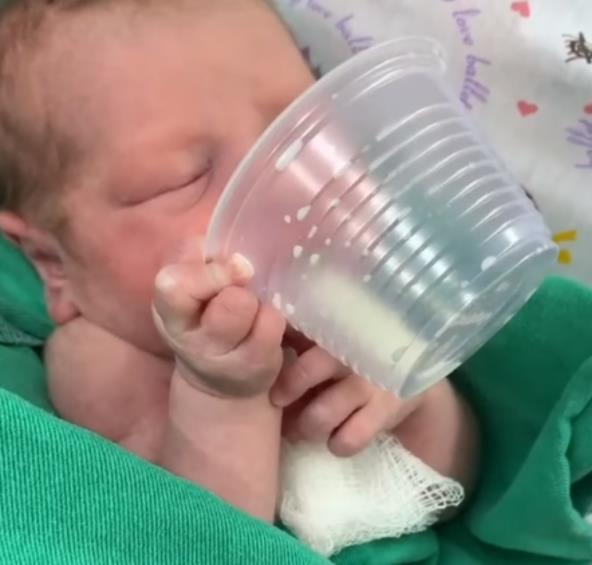 Ovoj bebi su po rođenju dali mleko na čašu. Babica je pridržavala, ali i ono je čvrsto zgrabilo svojom rukom. U jednom trenutku, babica je pustila čašu, a beba je regularno naginjala i pila sama.