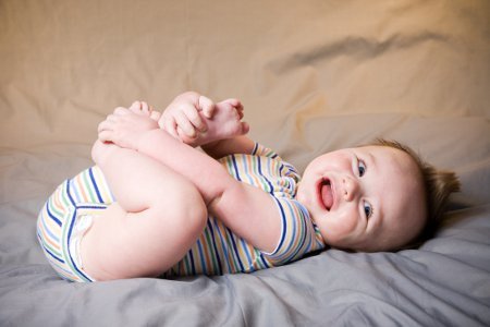 *U ležećem položaju, beba zauzima «sedeći» stav sa pravim trupom i nogama podignutim uvis, dodiruje svoja bedra i posmatra stopala. Tako jača mišiće potrebne za docnije sedenje, a da pritom ne opterećuje kičmeni stub, koji još nije dovoljno stabilan za vertikalno sedenje. Ako su noge vašeg deteta stalno opružene, porazgovarajte o tome sa pedijatrom.