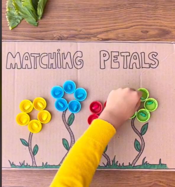 Na kartonu isrtajte drške cvetića, a umesto latica zalepite čepove. U boju čepova obojite i pasulj, pa dajte detetu da slaže po bojama. Na ovaj način razvijaće mnoge sposobnosti, a posebno će mu biti zanimljivo jer i samo može da učestvuje u pripremi igračke.