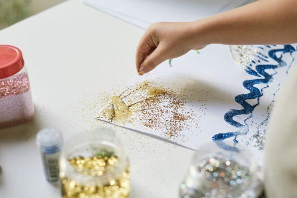 Dozvolite im da okrenu papir ili poslužavnik po potrebi da bi prekrili sa svih strana lepak sa šljokicama. Najlakše je ako pustite da se na kraju crteži osuše. Zatim možete otresti višak šljokica i očistiti.
