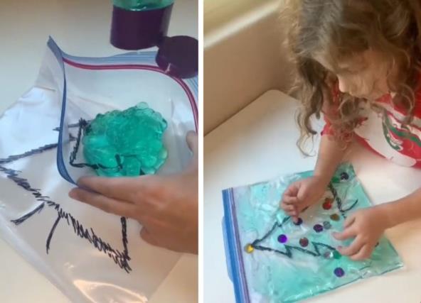 Na zip kesi nacrtajte jelku, a onda u kesu sipajte zeleni tečni sapun ili kupku, pa dodajte šarene perlice. Kesu dobro zatvorite i originalna igračka je spremna za zabavu. Mališani mogu da prevlače perlice po kesi, dodirivajući prstima iznad gnjecavog materijala, a perlice će klizati i zauzimati svoje mesto na nacrtanoj jelki.