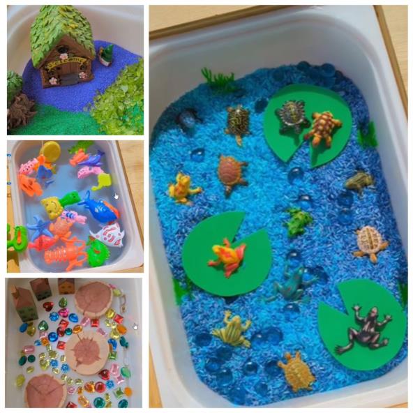 Ribnjak za žabe: plavo obojen pirinač penasti jastučići od ljiljana, plavi dragulji, žabe, kornjače, senzorni alati