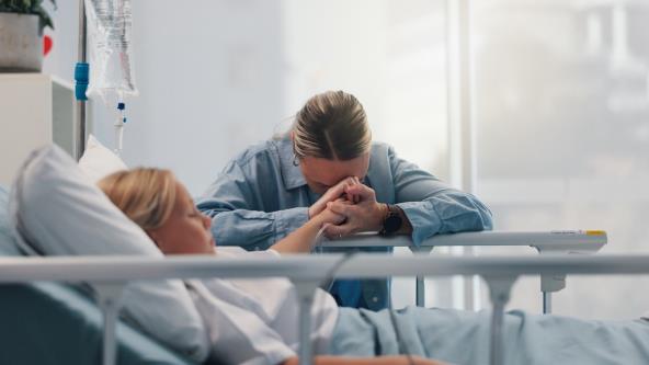 Mama drži devojčicu u bolnici za ruke