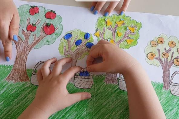 Dok crtamo voće učimo boje i vežbamo grafomotoriku. Količinu vežbamo dok brojimo koliko smo jabuka stavili u korpu. Šta je pre, a šta posle, pažljivo slušamo nalog i istim redosledom stavljamo različito voće u korpu.