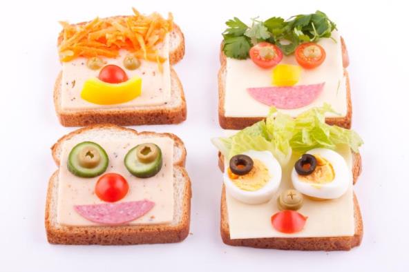 Parče tost hleba namazati buterom, preko staviti krišku salame i režanj čajne kobasice. Oči će biti od isečene zelene masline, nos i usta od kečapa, a oko usta staviti majonez. Kape i mašnice su od crvene paprike. Kosu napraviti od kačkavalja.