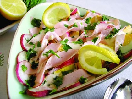 Tvrdo kuvana jaja iseći na četvrtine, šunku na štapiće a rotkvice na kolutiće. Izmešati iseckan peršunov list sa jogurtom, senfom, majonezom, limunovim sokom i malo soli. Poređati na tanjir jaja, šunku i rotkvice pa preliti jogurtom.