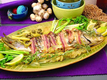 Veći pleh obložiti alu-folijom, dobro je nauljiti pa složiti crni luk sečen na rebarca. Preko staviti šarana sa slaninom, sve zaliti vinom, pleh zatvoriti alu-folijom i staviti u prethodno zagrejanu rernu na 220 ۫C da se peče. Nakon desetak minuta smanjiti temperaturu na 180 ۫C i nastaviti sa pečenjem, a nakon četrdesetak minuta, foliju skinuti da se riba zapeče. Gotovu ribu pažljivo premestiti na oval i ukrasiti.