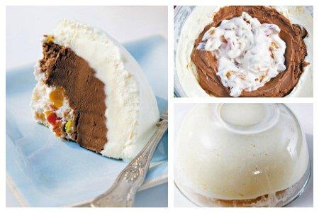 4. Smrznutu poslasticu okrenite na tanjir. Posudu prekrijte toplom krpom i sklonite je kada se smesa odvoji od posude, ali pazite da se ovaj spoljni sloj ne otopi previše.