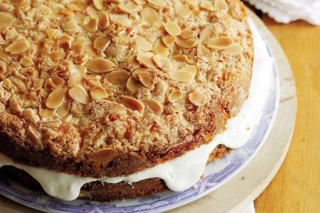 Propržite ljuspice badema, šećer, puter i mleko na niskoj temperature dok se šećer ne rastopi. Pospite brašno po testu u plehu i pritisnite nežno poleđinom kašike. Sipajte pripremljenu, vruću mešavinu po njemu i rasporedite tako da bude jednaka svuda. Pospite seckane bademe po vrhu i pecite 25 minuta. Ostavite da se ohladi 10 min u kalupu, a onda izvadite kolač.