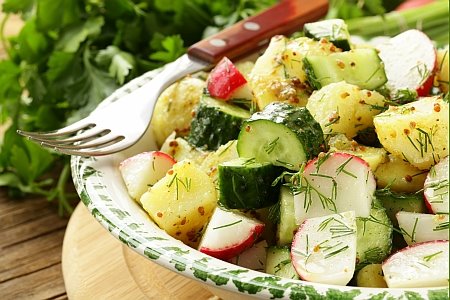 1. Operite krompir i u ljusci ga kuvajte 25 minuta. Očistite crveni luk i isecite ga na kolutove. Operite povrće. Rotkvice i krastavac isecite na kolutove. Sve sastojke pomešajte u činiji.