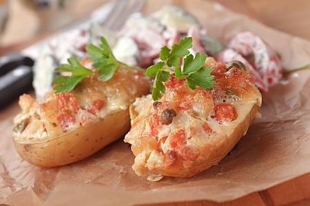 4. Zagrejati rernu na 200 stepeni. Spanać začiniti solju, biberom i žalfijom. Staviti krompir u podmazan kalup i puniti ga masom od spanaća. Na svaki krompir odozgo staviti list gaude, kao poklopac i peći u rerni oko 25 minuta. Ako krompir brzo tamni, poklopiti ga alu–folijom.