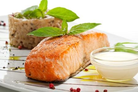 5. Oprati filete lososa, prosušiti ih i preliti sokom od limuna. Po ukusu posoliti i pobiberiti. Zagrejati 4 kašike maslinovog ulja u tiganju. Pržiti ribu sa svake strane po 3 minuta. Servirati sa salatom od pirinča i ukrasiti po želji.