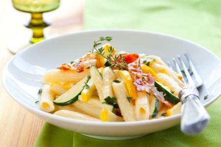 Odvojeno skuvati testeninu. Poslužiti je sa prelivom od tikvica i slanine.