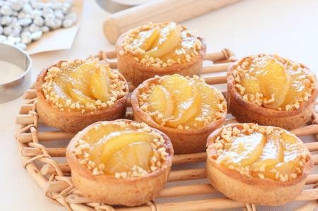 Testo izvadite iz frižidera i tanko ga razvaljajte. Isecite krugove i njih stavite na dno u podmazani pleh sa kalupima za mafine. Isecite trake od testa i time obložite stranice kalupa. Kalup s testom napunite filom. Pospite seckanim bademom.