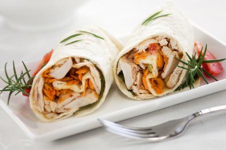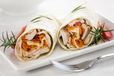 2. Na polovinu tortilje nanesite piletinu u sosu i pospite rendanim kačkavaljem. Tortilje zatim pričvrstite čačkalicom.