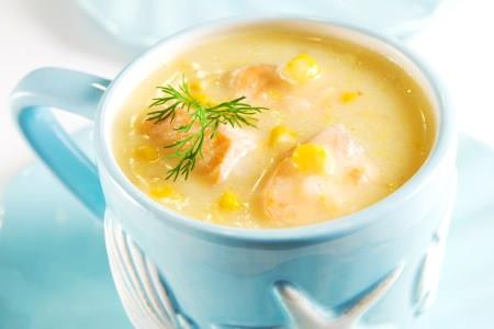 Skuvajte ribu u mleku (10 minuta), a u vodi krompir sa lorberovim listom. Izvadite ribu i krompir u toplu posudu. U mleko stavite kukuruz, kuvajte ga dva minuta, pa vratite ostale sastojke i malo ih izgnječite.