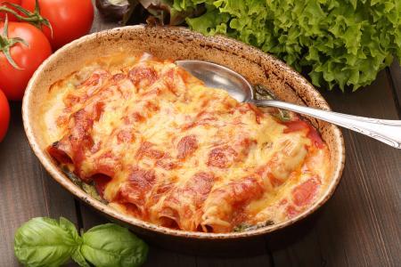 4. Sir izgnječiti i pomešati sa pavlakom pa dobijenom smesom odozgo premazati kanelone. Posuti rendanim ementalerom. Kanelone peći na srednjoj rešetki oko 20–25 minuta. Po želji posuti ruzmarinom.