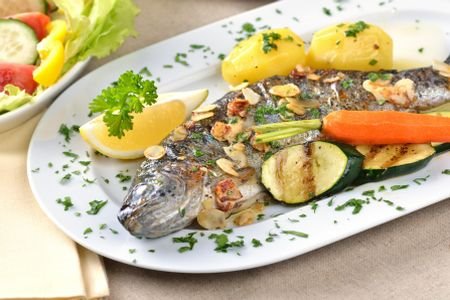 3. Preostale cele bademe stavite u zasečeni deo ribe. Pecite ribu u pokrivenoj vatrostalnoj posudi na 200° C.