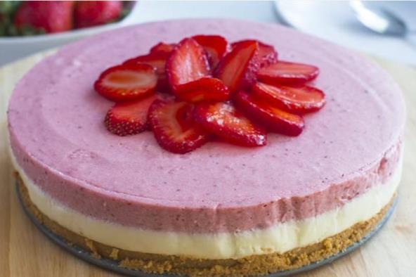 1. Toping. Prvo je poželjno napraviti toping, kako bi bilo vremena da se ohladi, dok pripremate mus od jagoda. Isecite jagode na četvrtine. Stavite jagode i šećer u tiganj i spremajte na srednjoj temperaturi dok se šećer ne otopi. Sklonite sa ringle i izmeljajte jagode koristeći blender. Stavite sa strane dok pripremate želatin.