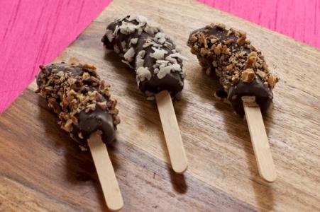 3. Presecite banane na pola i u svaku polovinu zabodite drveni štapić
