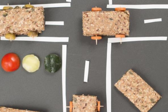 Savet: Napravite automobil od dve spojene pločice sa semenkama i dodajte točkove od šargarepe.