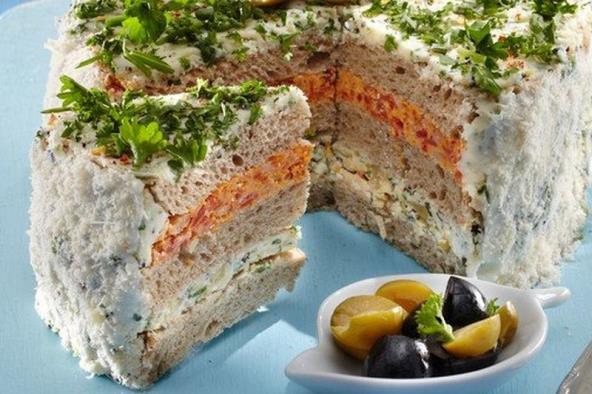 Preko poređati poslednji red tosta pa celu tortu premazati ostatkom fila sa tunjevinom.