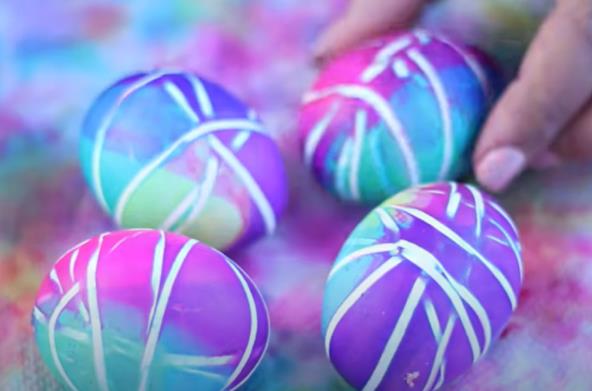 Kada izvadite jaje, ponovo svako stavite u različitu posudu s bojom, kako bi bila šarenija (na ovaj način ćete na jednom jajetu imati tri različite boje), ostavite da stoje pet minuta i nakon vađenja iz posušite ubrusom. Nakon toga samo uklonite gumice i dobili ste prelepa šarena jaja, koja još po želji na kraju možete da premažete uljem, kako bi bila sjajnija.