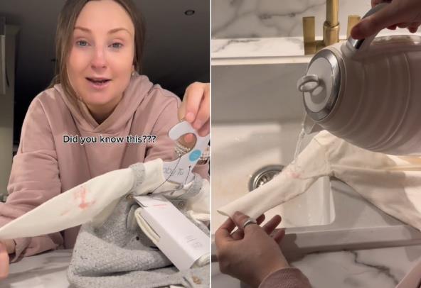 "Kažu da ključala voda poput magije uklanja fleke od voća, nije važno koje je voće, bilo šta. Sad ćemo da probamo", napisala je Ema, a zatim preko belog rukava na kojem je vidna crvena fleka, sipala proključalu vodu.