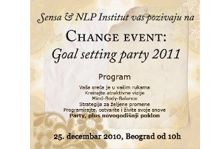 U Beograd Art Hotelu, u subotu, 25. decembra, s početkom u 10 časova, održaće se Goal Setting Party, gde ćete imati priliku da naučite da koristite praktičnu NLP tehnologiju i učinite svoj uspeh neizbežnim. Tim NLP trenera provešće vas, korak po korak, kroz proces planiranja 2011. godine i dalje budućnosti, a po receptu vrhunskih profesionalaca.