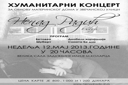 Na inicijativu pijaniste i profesora Fakulteta muzičke umetnosti u Beogradu, Nenada Radića, pokrenuta je akcija za obnovu Materinskog doma u Zvečanskoj ulici. Tim povodom, 12. maja održaće se humanitarni koncert ovog istaknutog pijaniste, a sav prihod od prodaje ulaznica biće uplaćen na račun Fonda B92 za obnovu sigurne kuće za trudnice u Zvečanskoj ulici.