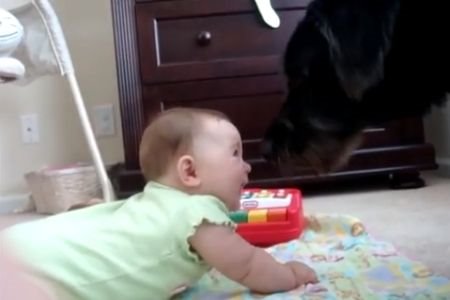 Snimak prikazuje dva prijatelja - malu bebu i velikog psa. Pas je ozbiljni čuvar, a beba bi samo da se zabavi. Ona oduševljeno posmatra svog prijatelja i prasne u smeh kad god on zalaje.