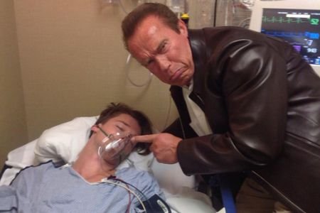 Arnold je napravio je tužan izraz lica i uperio prst u nesvesnog Patrika iako je ranije od lekara dobio dobre vesti. Njegov sin je, nakon buđenja, objavio ovu duhovitu porodičnu fotografiju i na Tviteru napisao: