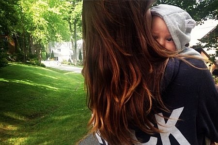 Ona je okrenula leđa foto-aparatu i držala u naručju svog sina, a u prvom planu su njegovi obraščići i radoznale oči, kao i natpis na njenoj majici.