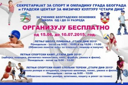 Sekretarijat za sport i omladinu Beograda i Gradski centar za fizičku kulturu Stari DIF organizovaće besplatne letnje kampove u periodu od 15. juna do 10. jula za učenike beogradskih škola.