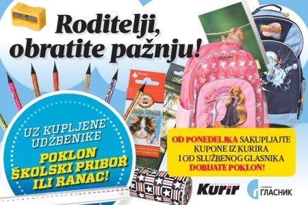 3. Kada sakupite svih pet kupona i zalepite ih na talon, posetite bilo koju knjižaru “Službenog glasnika” i prilikom kupovine udžbenika, predajte popunjen talon. U zavisnosti od cene, dobijate odgovarajući poklon: komplet školskog pribora ili ranac.