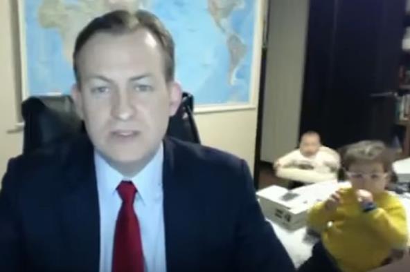 Dok se iz svog doma javljao uživo u program BBC-ja, putem web-kamere, u sobu je ponosno ušetala njegova starija ćerka, i stala pored njega. Iako je i to neočekivano i već dovoljno smešno, tu nije bio kraj ovog neobičnog uključenja. Iza leđa uvaženog politikologa, kroz vrata koja su ostala otvorena, 'dovozala' se i beba u dupku.