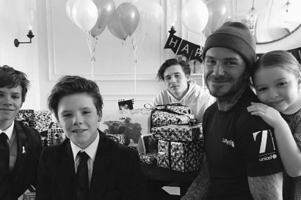 Naime, širokog osmeha Dejvid je pozirao sa sinovima i ćerkicom na rođendanskom doručku, dok je mama bila iza objektiva.