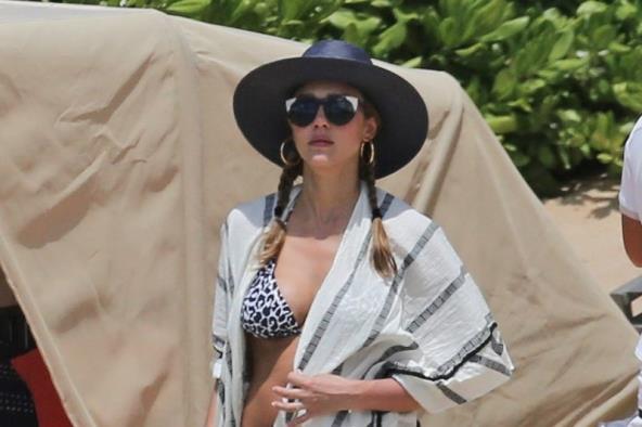 Iako je na plaži nosila ogrtač, paparaci su ipak uspeli da "ulove" njen zaobljeni stomačić.