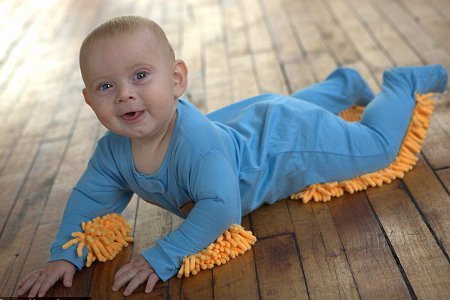 Specijalno odelo za bebe na rukavima i nogavicama ima našivene mikrofiber krpe, koje omogućavaju bebama da čiste i glancaju pod dok zapravo uče da puze.