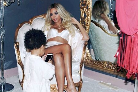 Na glamuroznoj beloj fotelji, odevena u satensku kućnu haljinu i beli veš, i sa razbarušenom platinasto plavom kosom, Bijonse posmatra svoju dvogodišnju ćerku. Ovo je ukratko opis fotografija koje su juče osvanule na Tumblr stranici ove poznate pevačice.