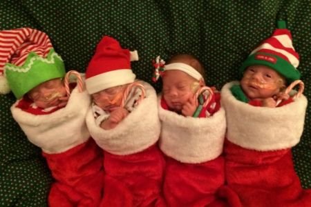 Alisa, Karter, Majls i Bentli rođeni su u septembru, u 25. nedelji. Pošto su još uvek veoma male, bebe su pozirale u božićnim čarapama. Dečaci su nosili šarene kapice, a jedina devojčica ukrasnu traku.