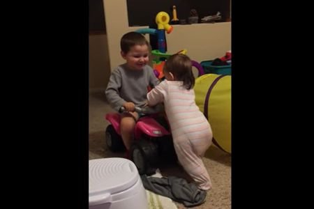 Dok se devojčica pridržava za njegov automobilčić, dečak polako vozi unazad kako bi seka morala da napravi korak.