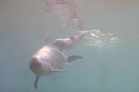 Ona je iščekujući mladunca plivala između zaposlenih ovog centra i delovala kao da se ne dešava ništa posebno, a zatim je malo peraje izvirilo ispod njenog...