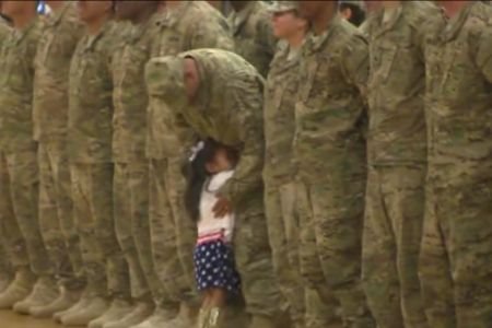 Video je zabeležila lokalna televizijska stanica, kada je devojčica u sred protokola dobrodošlice vojnicima pritrčala svom tati koji ju je snažno zagrlio.