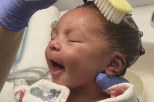 Iako stara tek nekoliko dana, ova beba se bez problema prepustila uživanju u pranju kose.