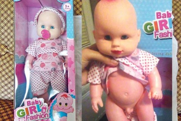Na kutiji je velikim slovima bilo precizirano "baby girl". Igračka je bila obučena u tonove koje nose bebe devojčice a i usta su joj našminkana. A kad se ta odeća skine - lutka ima muški polni organ.