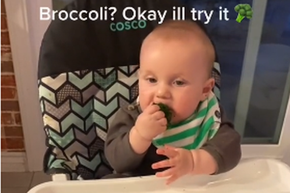Baby trying broccoli for the first time. #momsoftiktok#babyledweaning#badmomsoftiktok#babysfirst#ewbroccoli#funnybabies